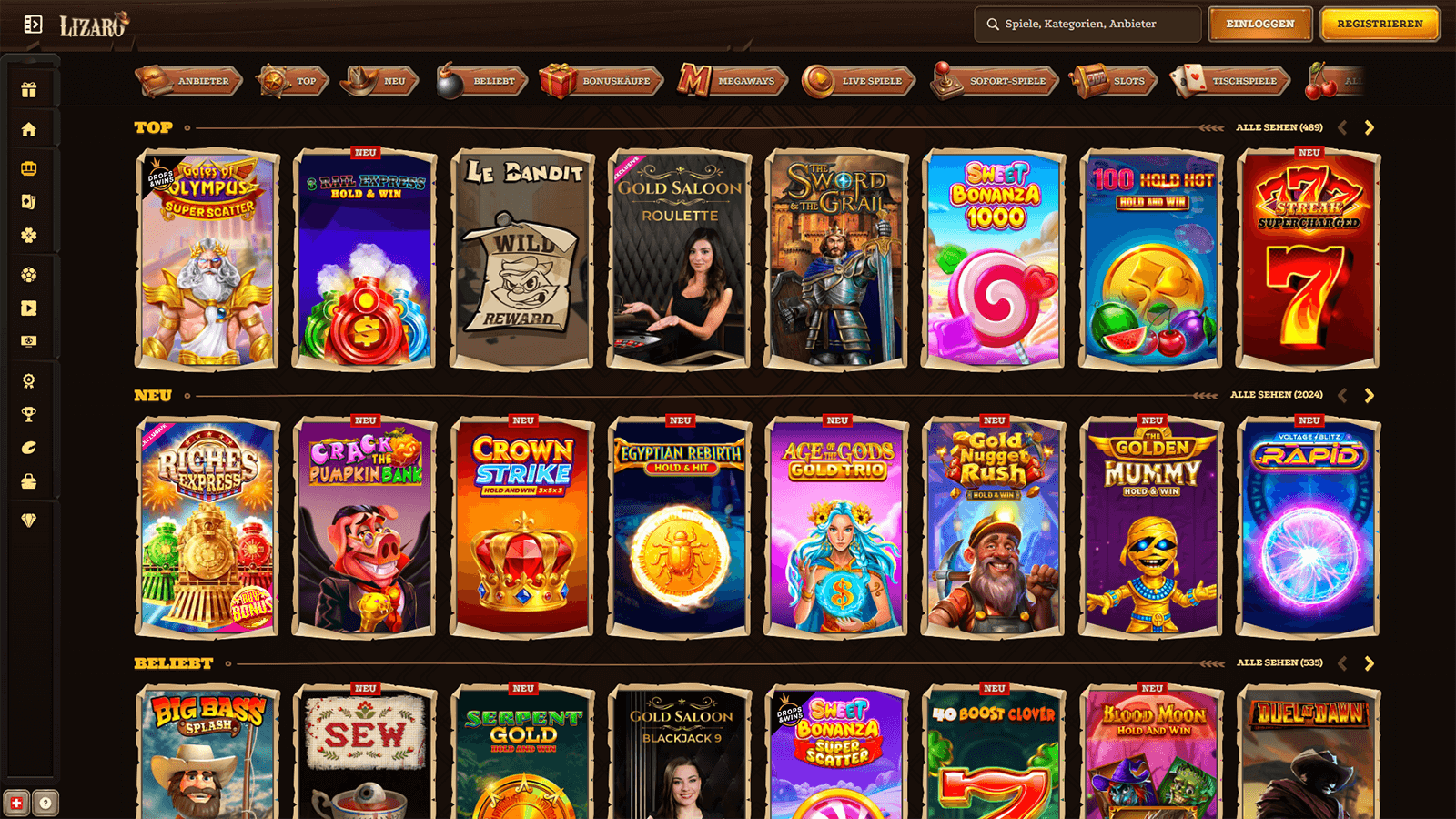 De Lizaro-slotcollectie biedt meer dan 10.000 spellen in samenwerking met meer dan 100 leveranciers, waaronder Pragmatic Play, Spinomenal, Play ‘n GO en Novomatic. De spellen zijn overzichtelijk ingedeeld in categorieën zoals topgames, nieuwe releases, bonusspellen en Megaways. Lizaro voegt regelmatig nieuwe titels toe en markeert deze duidelijk voor gemakkelijke herkenning. De lijst Hieronder vindt u een overzicht van de meest populaire Lizaro-slots: